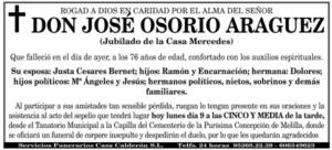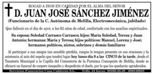 ESQUELA DE D. JUAN JOSÉ SÁNCHEZ JIMÉNEZ (Funcionario de la C. Autónoma de Melilla, Electromecánica, jubilado) 09/01/2017 Leer más »