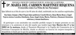 ESQUELA DE Dª. MARÍA DEL CARMEN MARTÍNEZ REQUENA (Conocida como La Niña de las Naranjas) 17/01/2017 Leer más »
