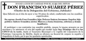 ESQUELA DE DON FRANCISCO SUÁREZ PÉREZ (Chofer de la Delegación del Gobierno, Jubilado) 08/04/2018 Leer más »