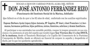 ESQUELA DE DON JOSÉ ANTONIO FERRÁNDEZ RIZO (Funcionario del Instituto Social de la Marina, Jubilado) 11/01/2019 Leer más »