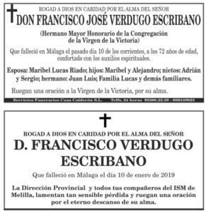 ESQUELA DE DON FRANCISCO JOSÉ VERDUGO ESCRIBANO (Hermano Mayor Honorario de la Congregación de la Virgen de la Victoria) 11/01/2019 Leer más »