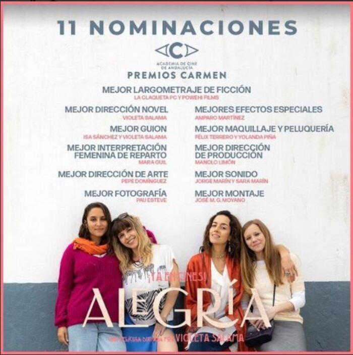 Cada una de estas dos películas ha recibido 11 nominaciones. En el caso de ‘Alegría’, opta al premio en las categorías de mejor largometraje de ficción, mejor guion (Isa Sánchez y Violeta Salama), mejor interpretación femenina de reparto (Mara Guil), mejor dirección de arte (Pepe Domínguez), mejor fotografía (Pau Esteve), mejores efectos especiales (Amparo Martínez), mejor maquillaje y peluquería (Félix Terrero y Yolanda Piña), mejor dirección de producción (Manolo Limón), mejor sonido (Jorge Marín y Sara Marín) y mejor montaje (José M.G. Moyano).