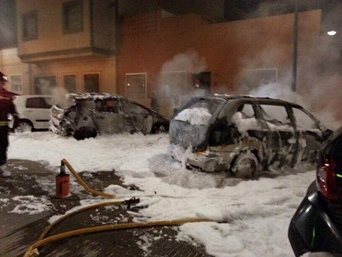Un incendio registrado ayer de madrugada en la calle Orán, en el Barrio de la Victoria, afectó a cinco vehículos estacionados en la vía pública. Tres de ellos quedaron totalmente calcinados por las llamas, que también alcanzaron la puerta de una vivienda cercana. Según informaron a MELILLA HOY fuentes policiales, los hechos ocurrieron en torno a las 6,15 horas y hasta el lugar se desplazaron dos camiones de Bomberos y ocho efectivos, que tuvieron que emplear espuma además de agua para sofocar el incendio debido a su magnitud.