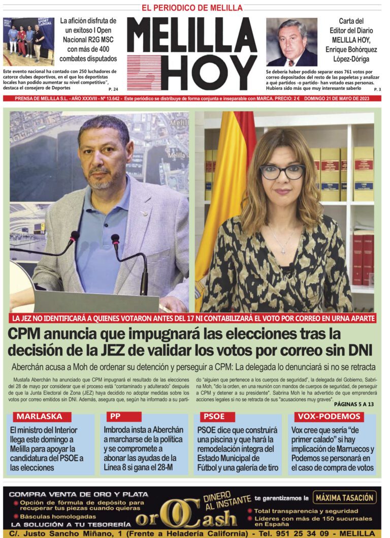 Consulte la portada de MELILLA HOY del domingo 21 de mayo de 2023