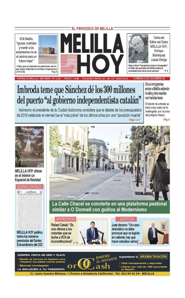 Consulte la portada de MELILLA HOY del DOMINGO 23 de diciembre de 2018