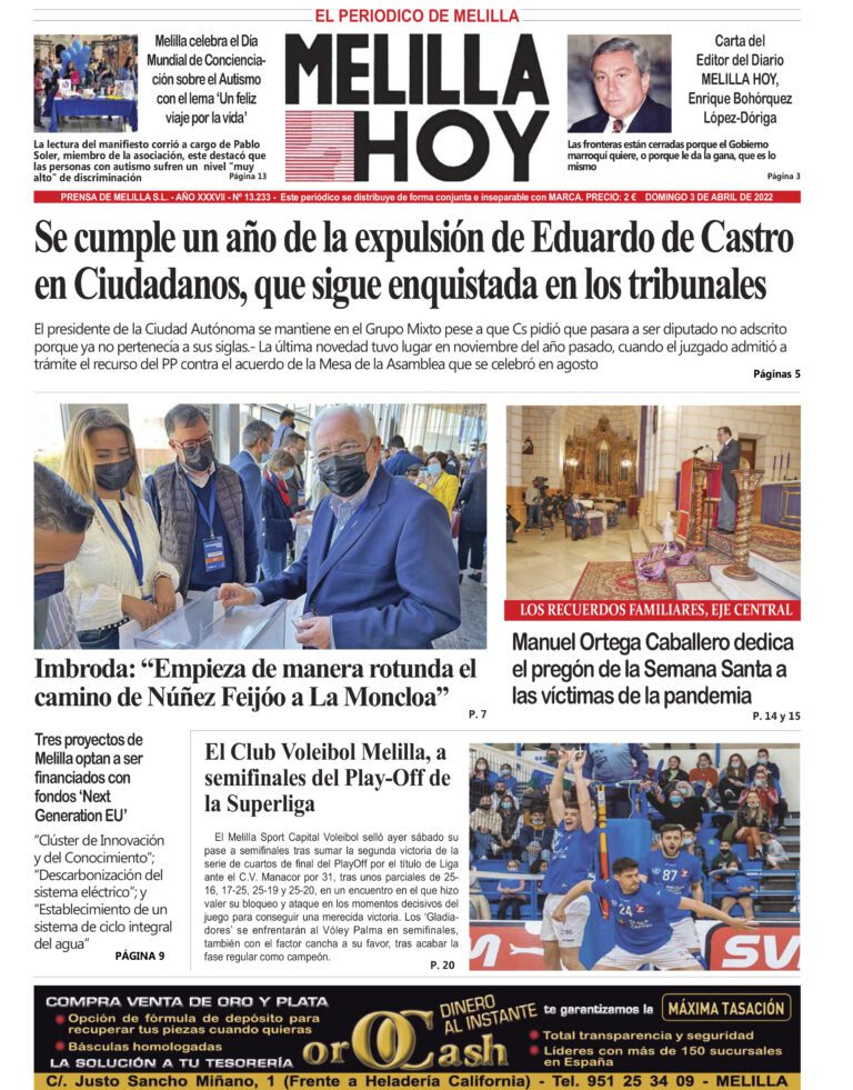 Consulte la portada de MELILLA HOY del DOMINGO 3 de abril de 2022