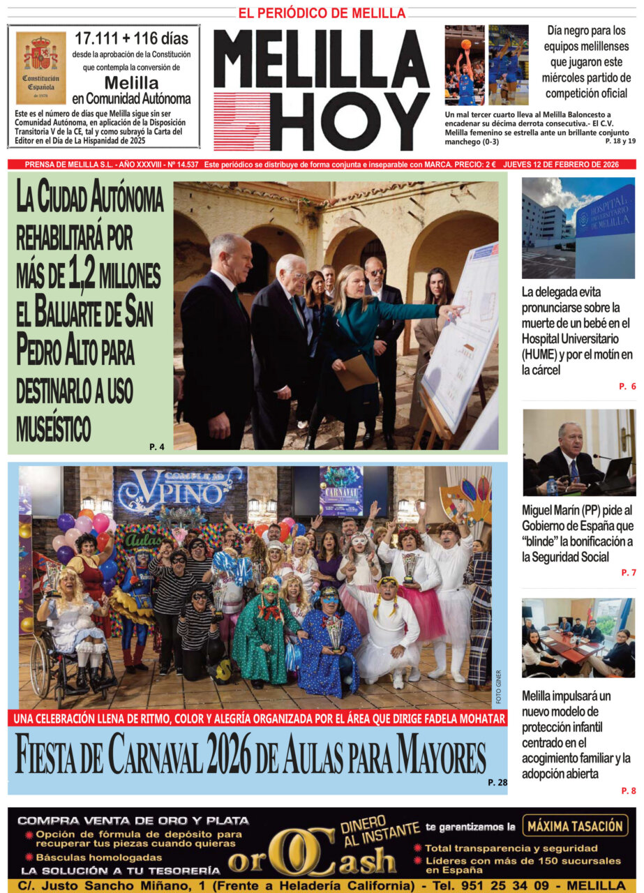 Consulta la portada del periódico Melilla Hoy del 12 de febrero de 2026.