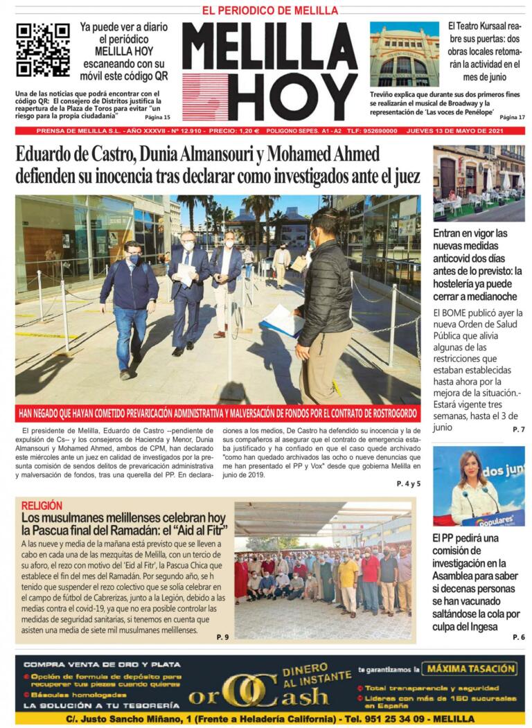 Consulte la portada de MELILLA HOY del JUEVES 13 de mayo de 2021