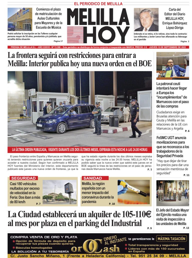 Consulte la portada de MELILLA HOY del jueves 15 de septiembre de 2022