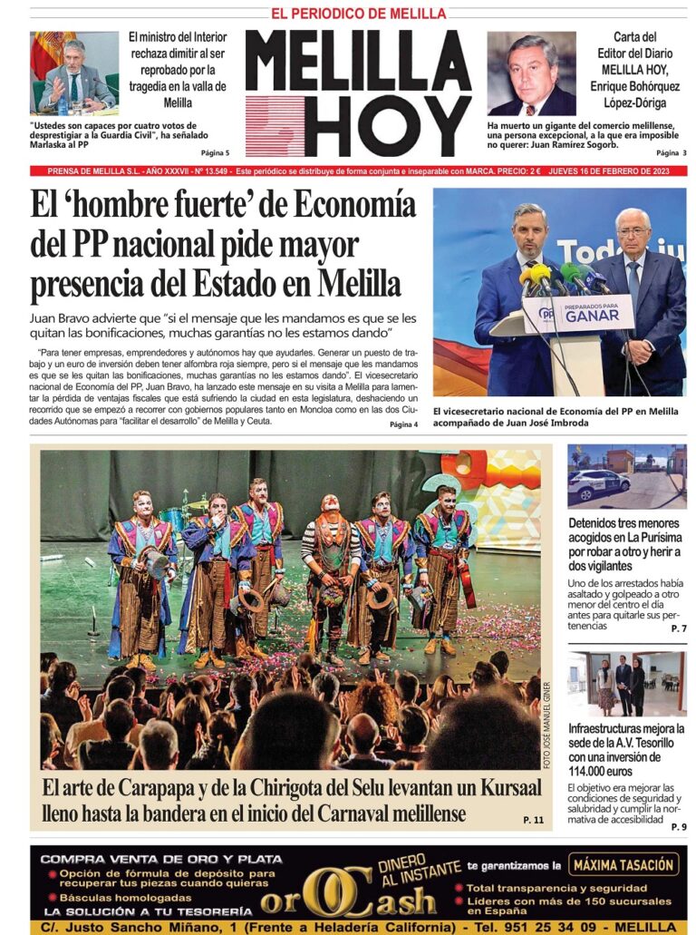 Consulte la portada de MELILLA HOY del jueves 16 de febrero de 2023