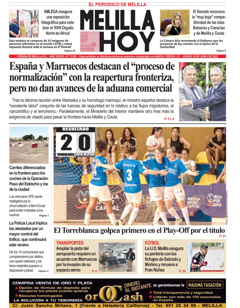 Consulte la portada de MELILLA HOY del jueves 16 de junio de 2022