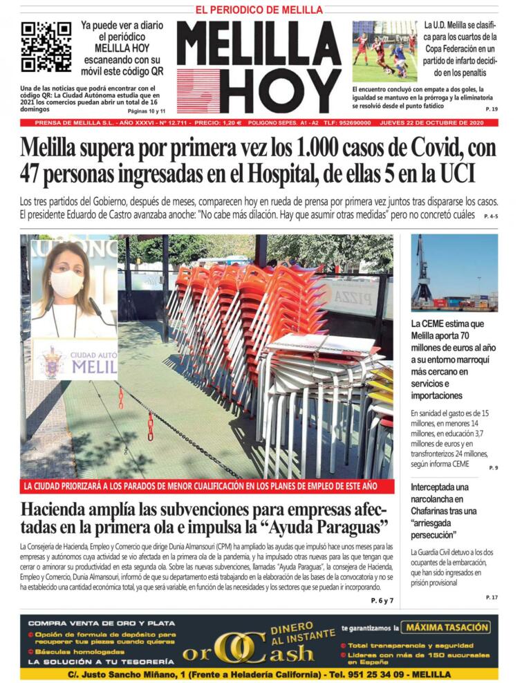 Consulte la portada de MELILLA HOY del JUEVES 22 de octubre de 2020