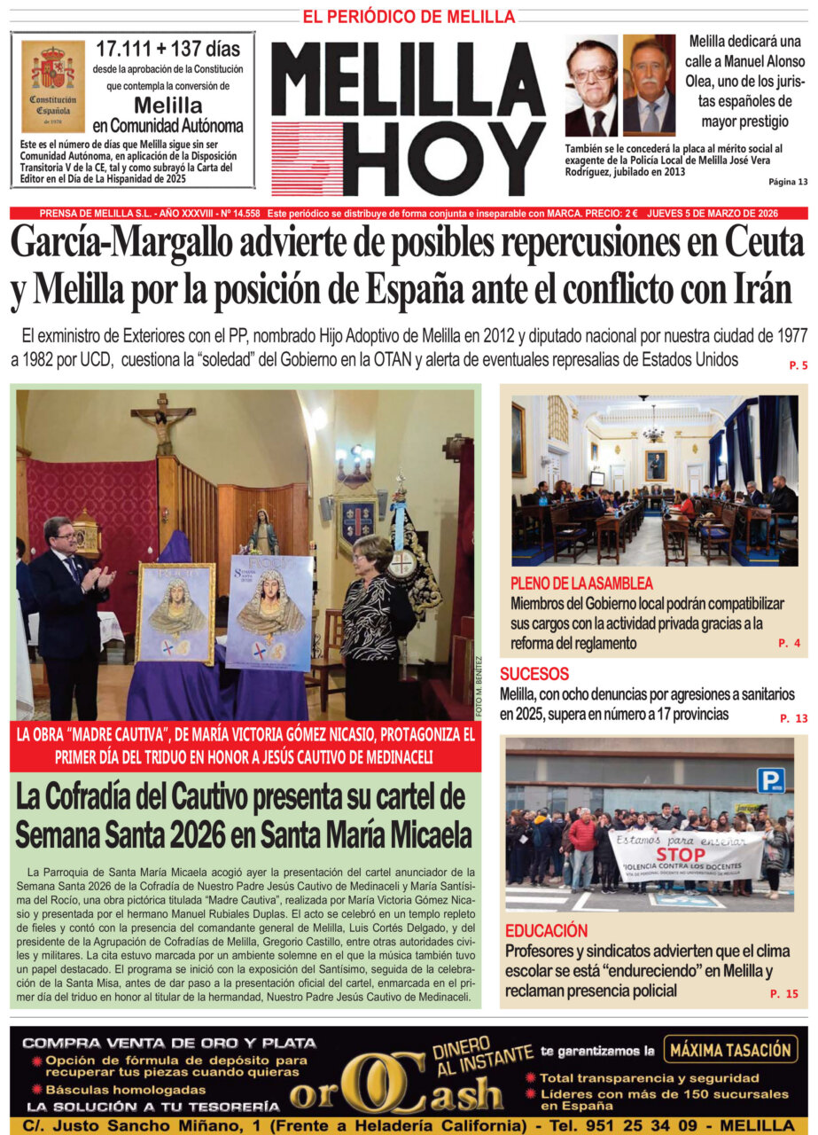 Consulta la portada del periódico Melilla Hoy del 5 de marzo de 2026.