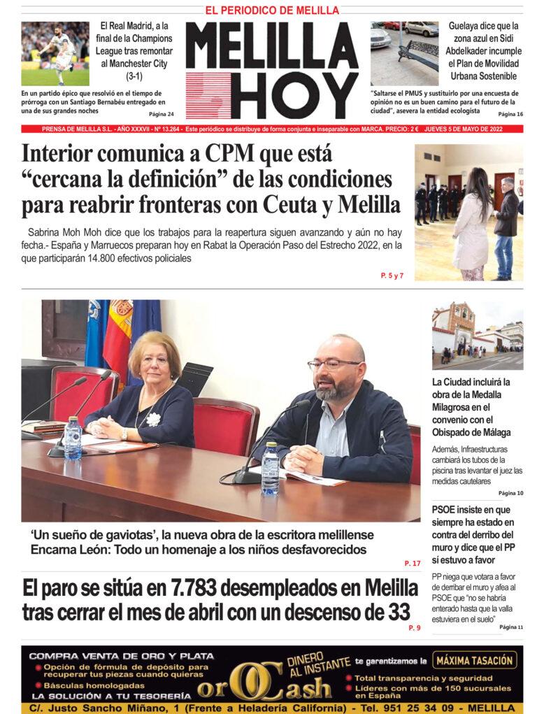 Consulte la portada de MELILLA HOY del JUEVES 5 de mayo de 2022
