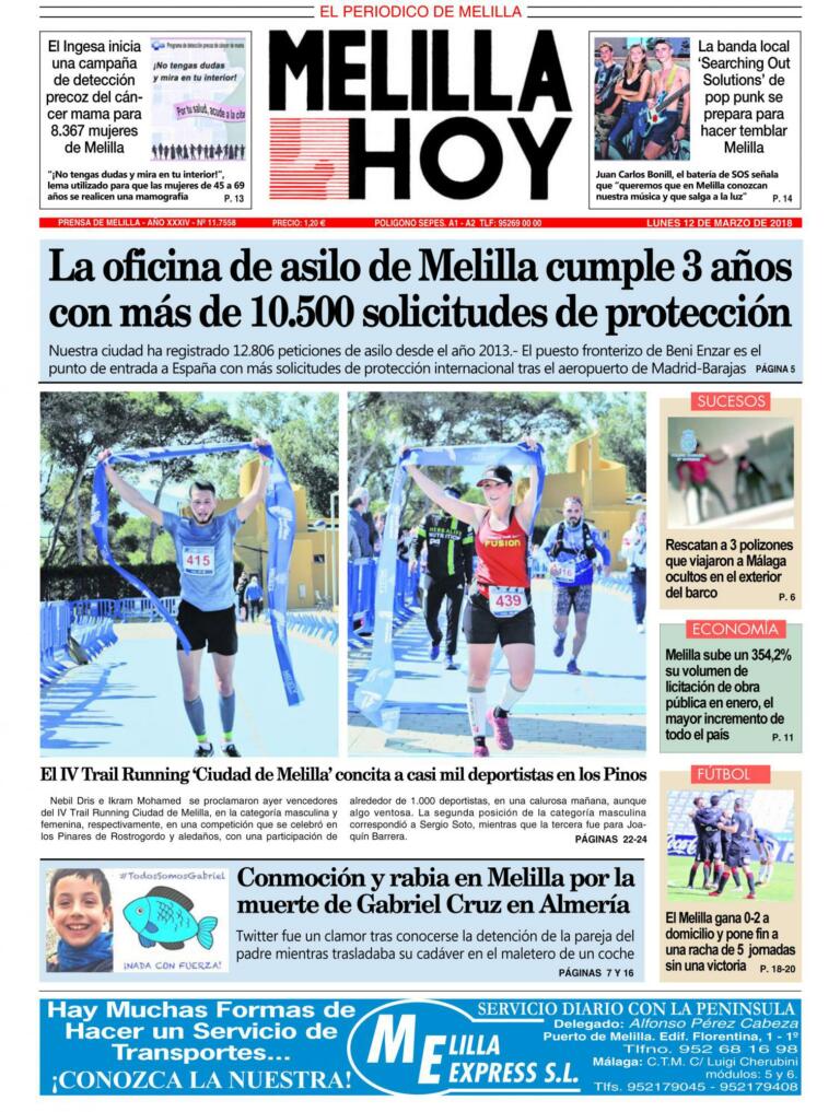 Consulte la portada de MELILLA HOY del lunes 12 de marzo de 2018