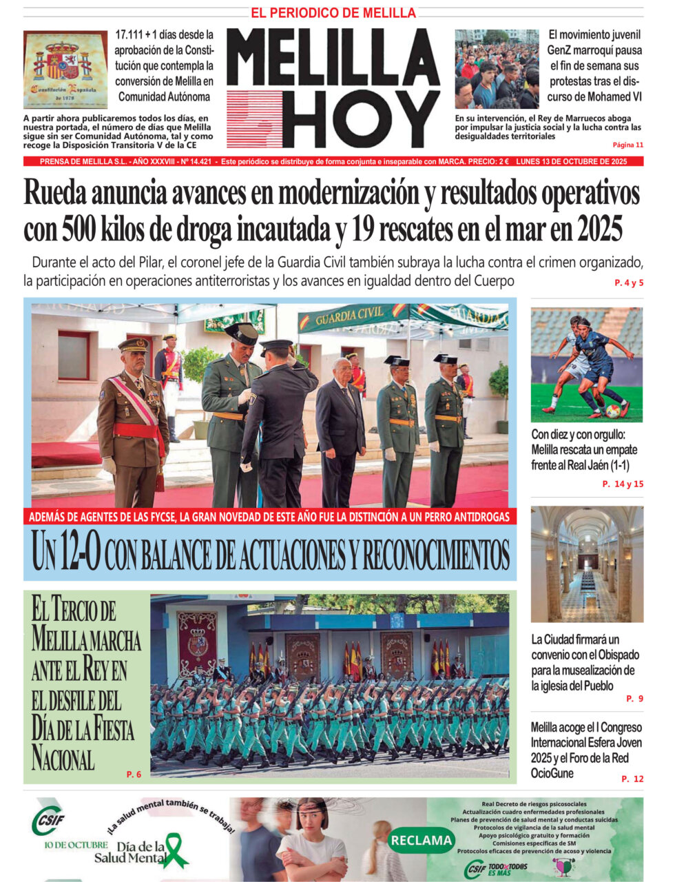 Consulta la portada del periódico Melilla Hoy del 13 de octubre de 2025.