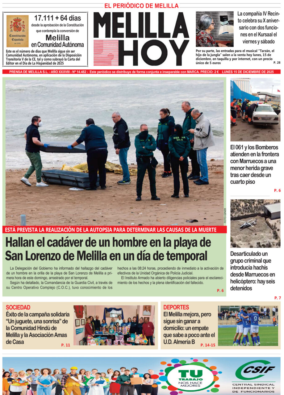 Portada del diario Melilla Hoy con noticias del 15 de diciembre de 2025.