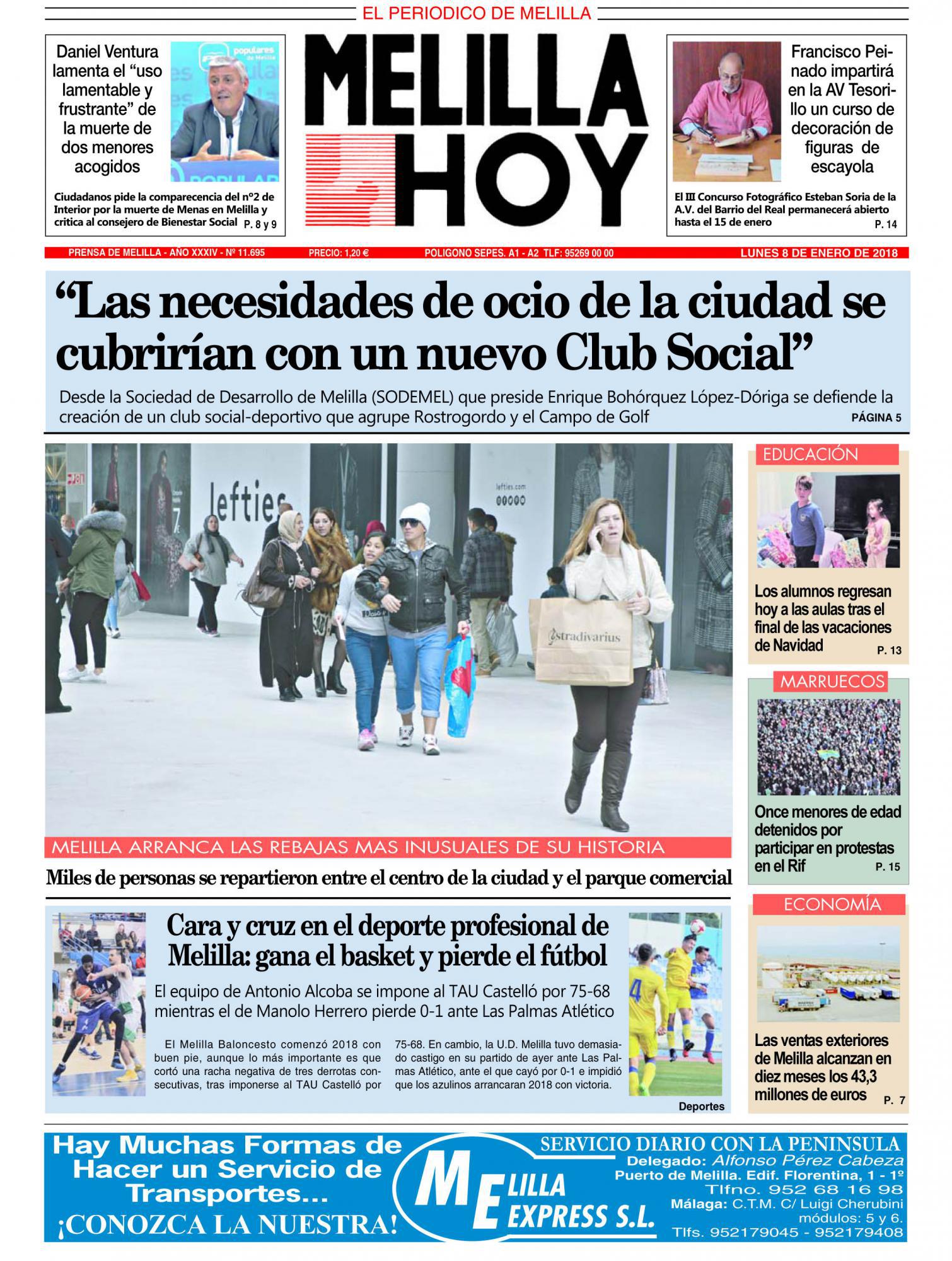 Consulte la portada de MELILLA HOY del LUNES 8 de enero de 2018