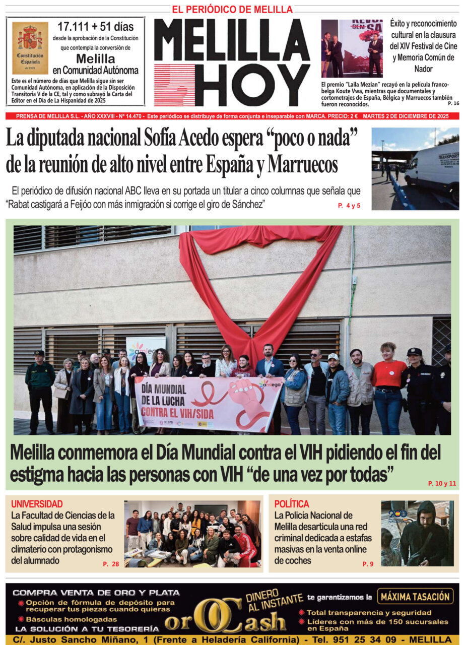 Portada del diario Melilla Hoy con noticias del 2 de diciembre de 2025.