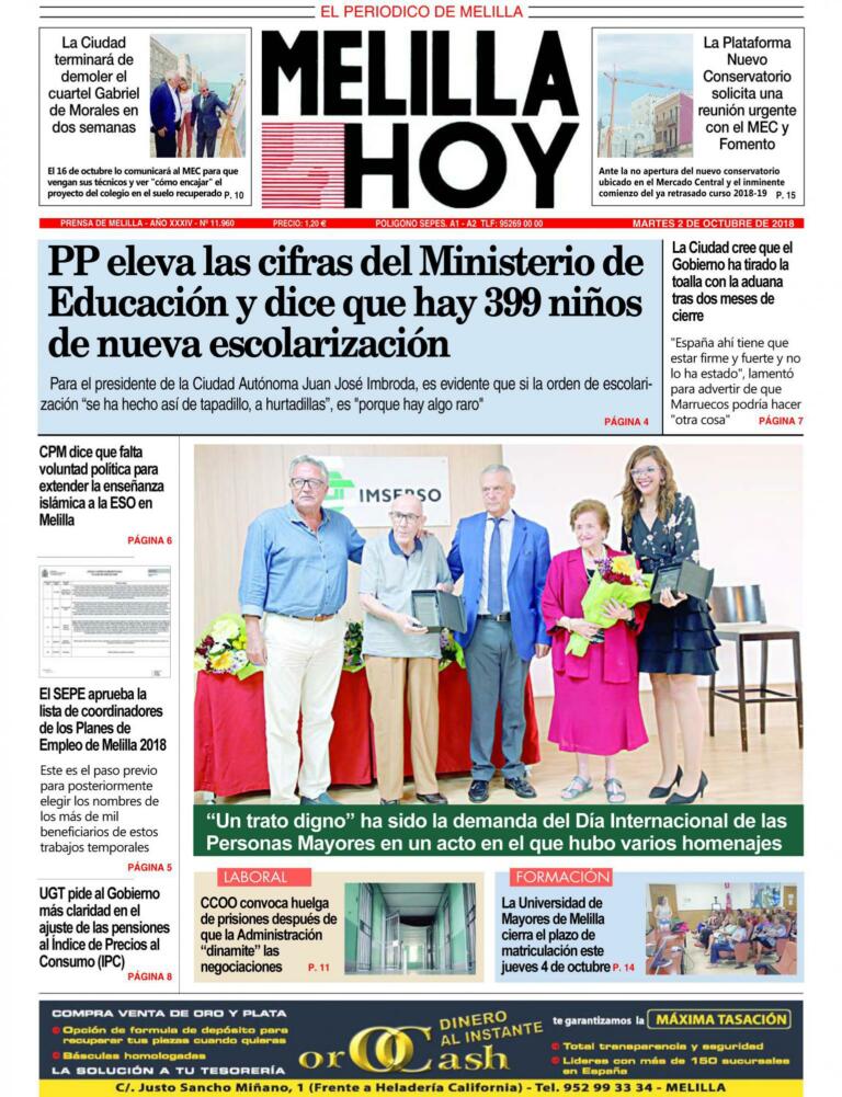 Consulte la portada de MELILLA HOY del MARTES 2 de octubre de 2018