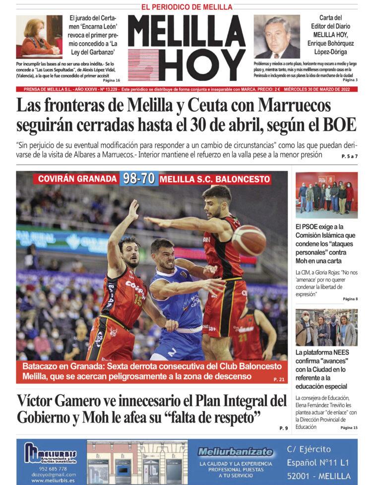Consulte la portada de MELILLA HOY del MIÉRCOLES 30 de marzo de 2022