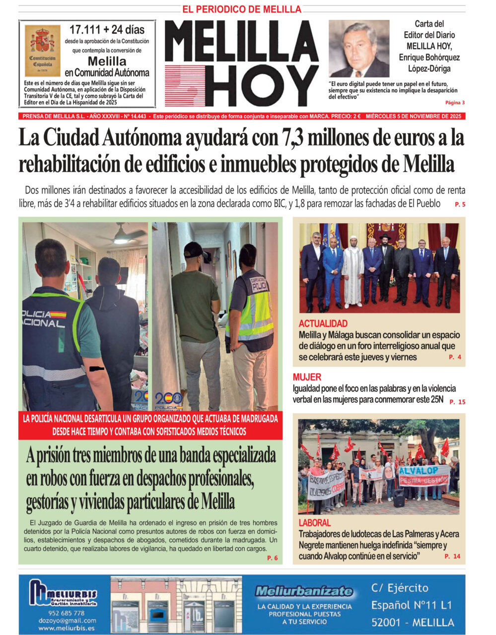 Portada del diario Melilla Hoy del miércoles 5 de noviembre de 2025.