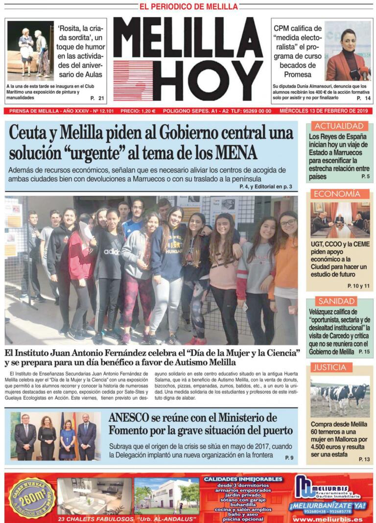 Consulte la portada de MELILLA HOY del MIÉRCOLES 13 de febrero de 2019