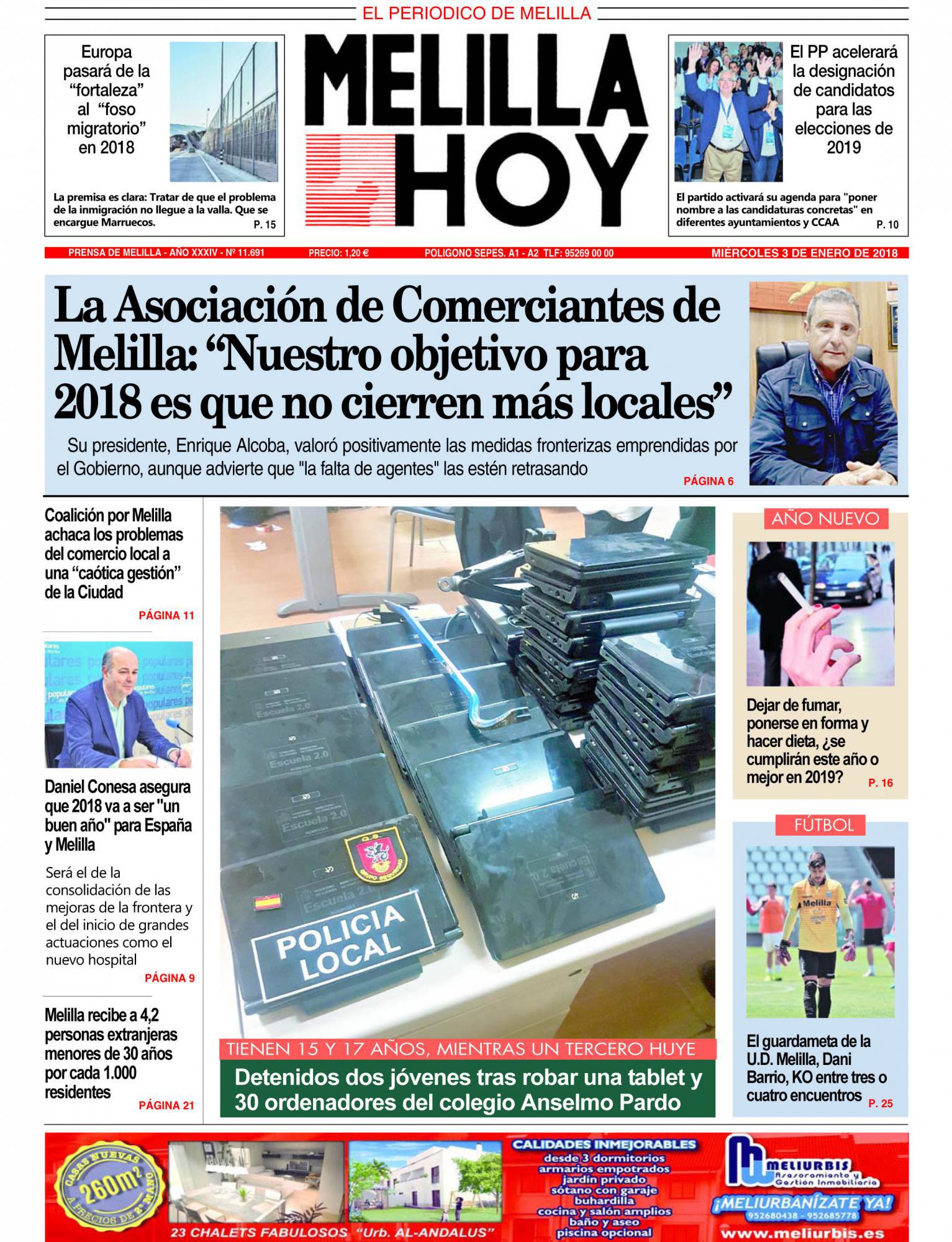 Consulte la portada de MELILLA HOY del MIÉRCOLES 3 de enero de 2018