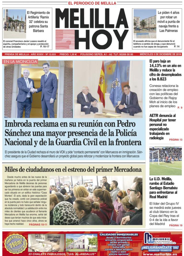 Consulte la portada de MELILLA HOY del MIÉRCOLES 5 de diciembre de 2018