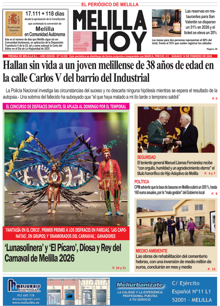 Consulta la portada del periódico Melilla Hoy del 14 de febrero de 2026.