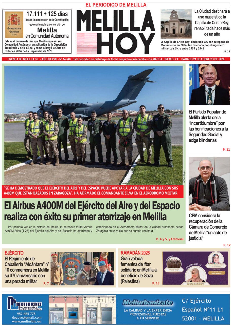 Portada del periódico Melilla Hoy con noticias del 21 de febrero de 2026.