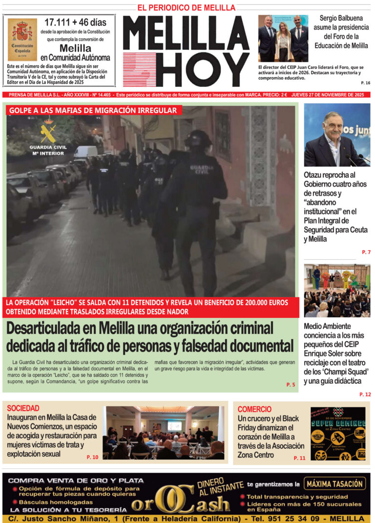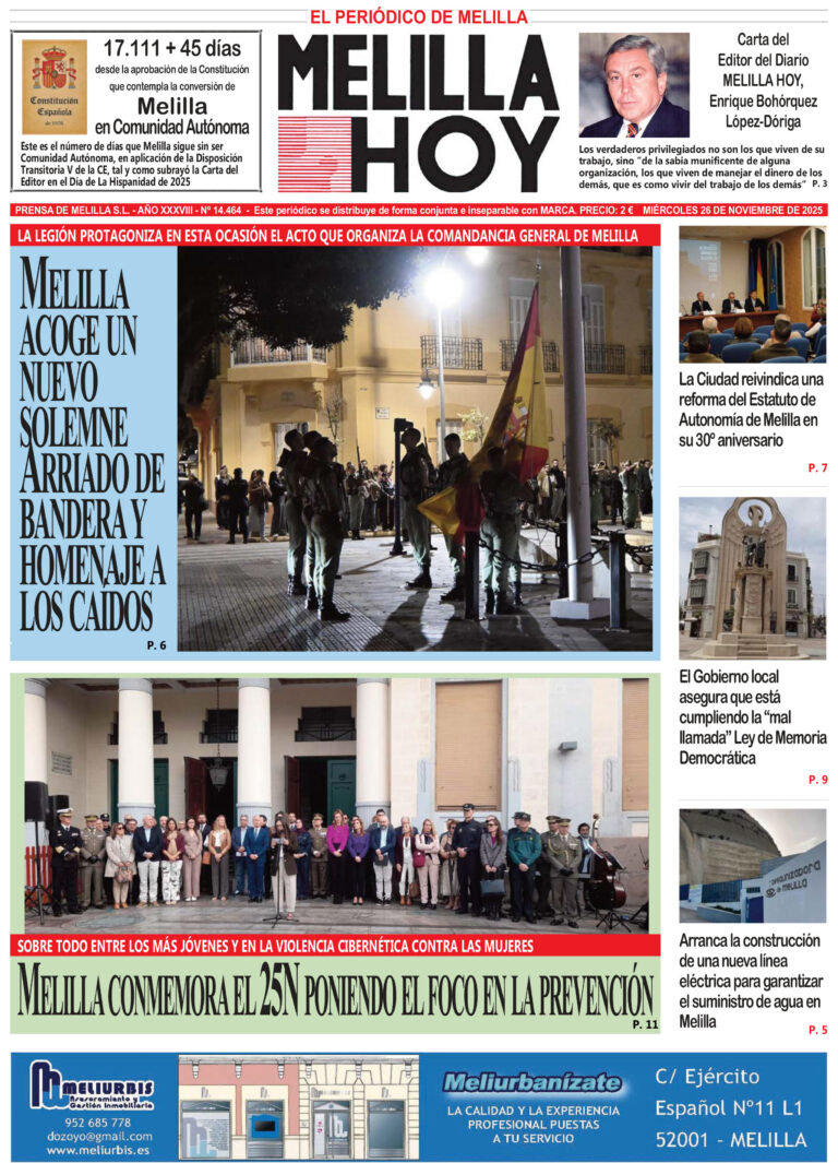 Consulte la portada de MELILLA HOY del sábado 29 de noviembre de 2025