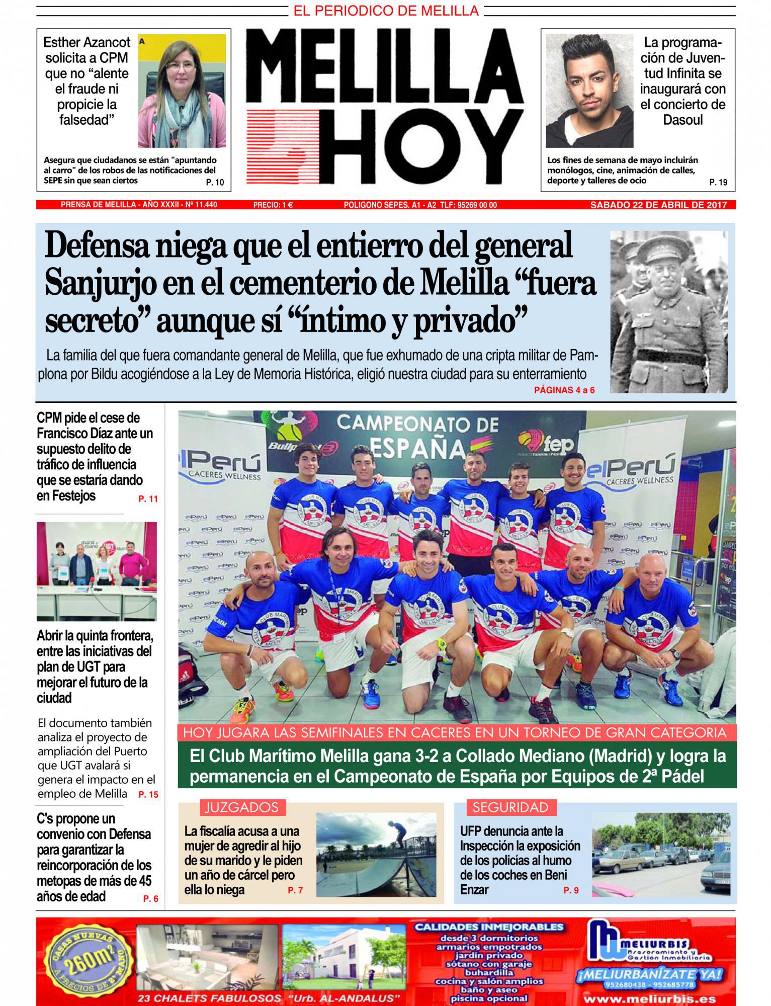 Consulte la portada de MELILLA HOY del SÁBADO 22 de abril de 2017