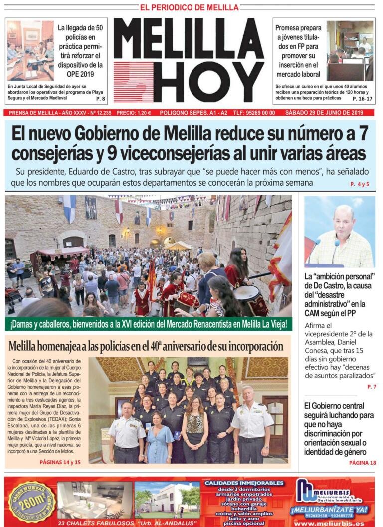 Consulte la portada de MELILLA HOY del SÁBADO 29 de junio de 2019