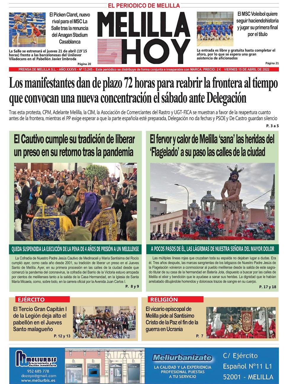 Consulte la portada de MELILLA HOY del viernes 15 de abril de 2022