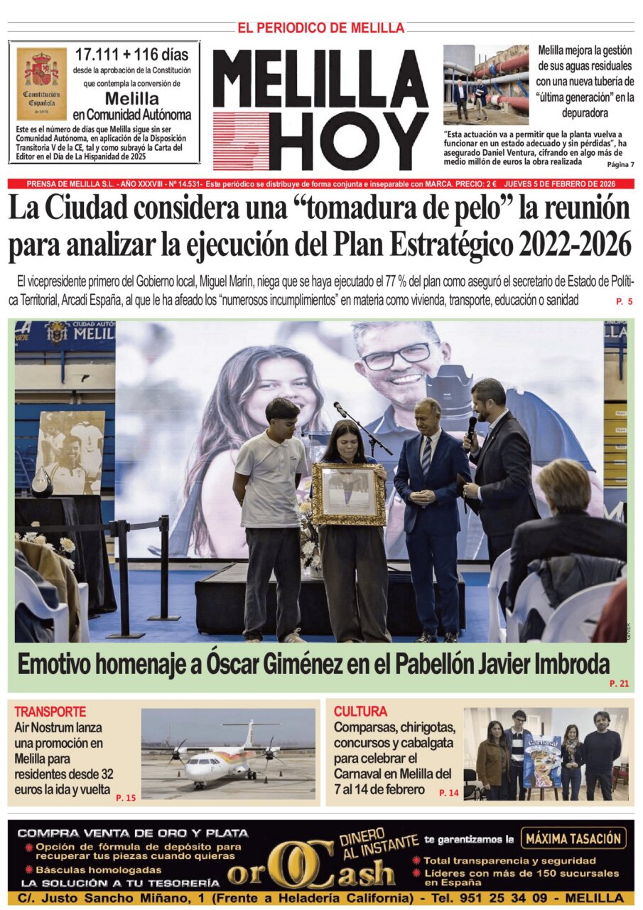 La portada del periódico Melilla Hoy del 5 de febrero de 2026 presenta importantes noticias locales.