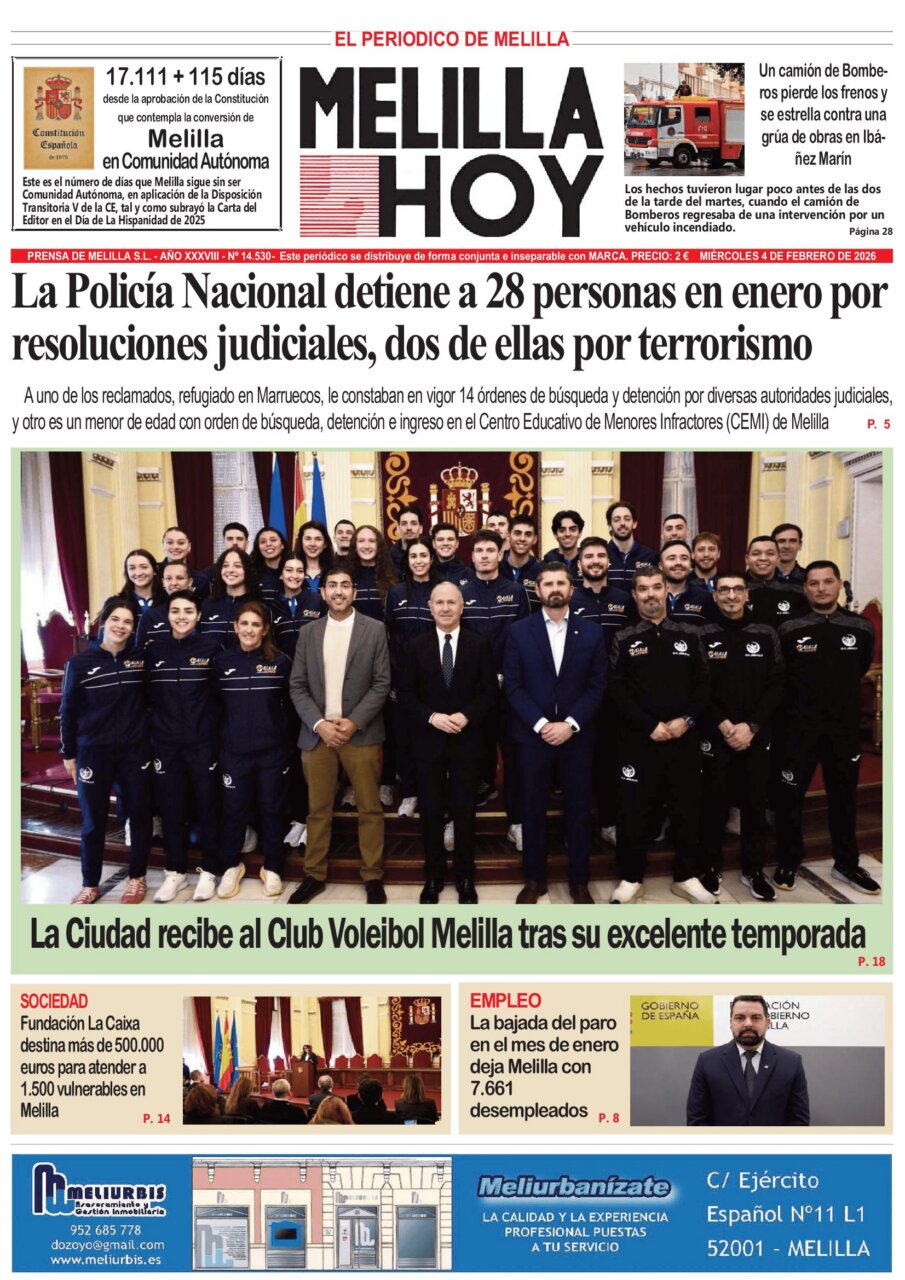 La portada del periódico Melilla HOY presenta noticias locales del 4 de febrero de 2026.