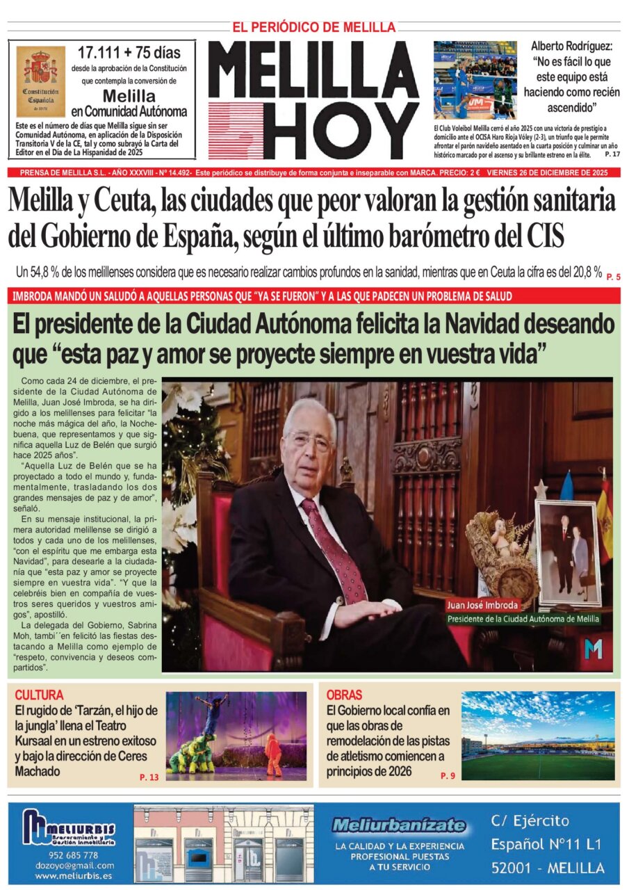 La portada del periódico Melilla Hoy destaca noticias locales y un mensaje navideño.