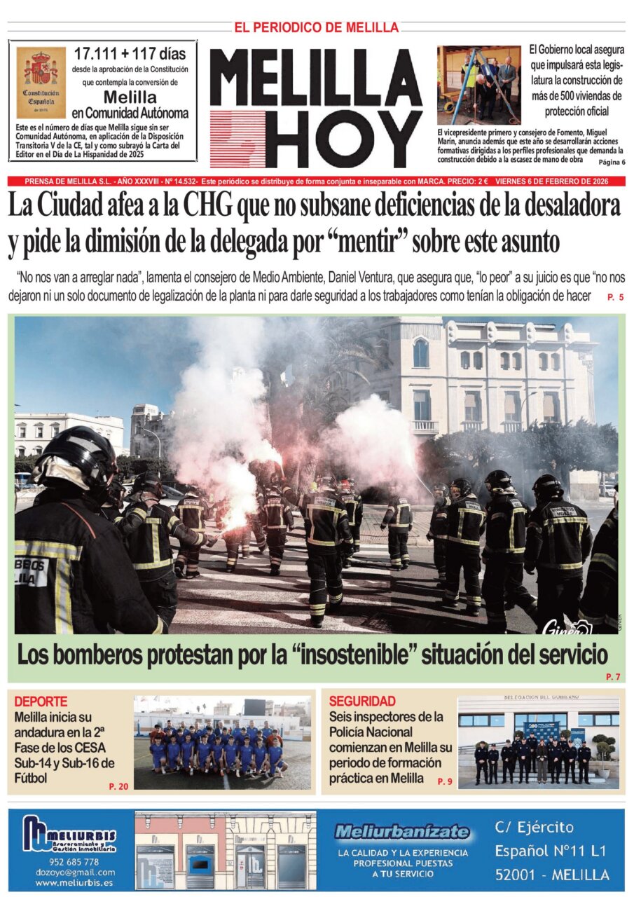 La portada del Melilla Hoy presenta protestas de bomberos por la situación del servicio.