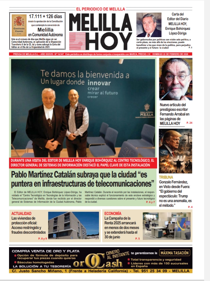 Consulta la portada del periódico Melilla Hoy del 22 de febrero de 2026.