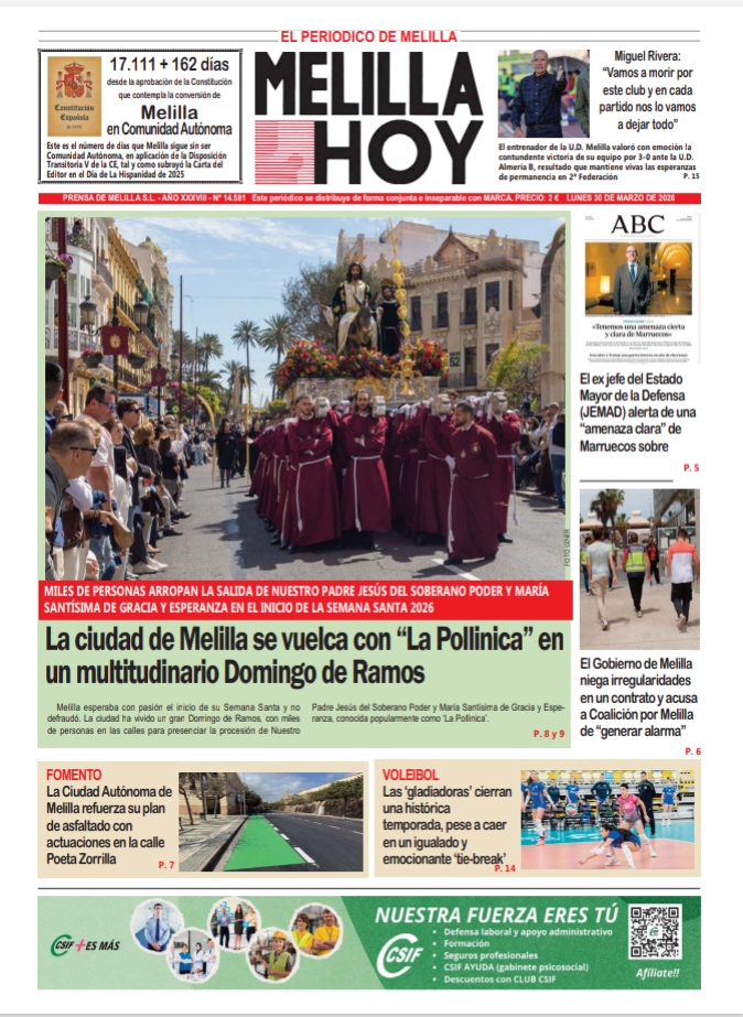 Consulta la portada del periódico Melilla Hoy del 30 de marzo de 2026.