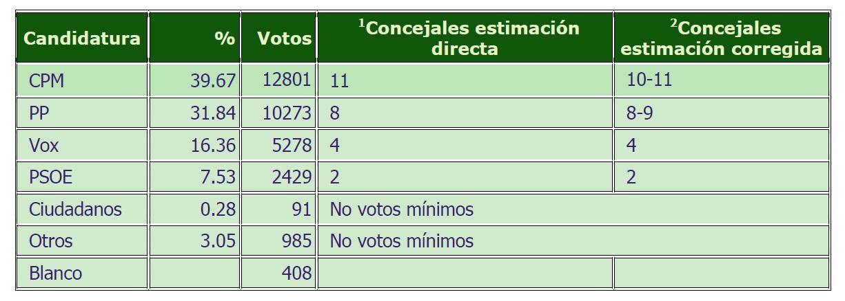Ya más alejados Vox con el 16.36% de los votos, con un total de 5.278 papeletas, que le equivaldrían a 4 diputados y el PSOE con el 7.53%; con 2429 sufragios, para lograr con ello 2 escaños. El resto de fuerzas no lograrían representación.