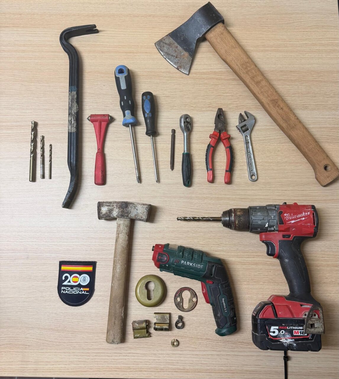 En el registro del vehículo, los agentes hallaron una bolsa con diversas herramientas utilizadas habitualmente para cometer robos con fuerza, entre ellas una palanqueta tipo pata de cabra, un bombín fracturado, un taladro autónomo, una machota, un hacha y otros utensilios. Paralelamente, en el interior del piso donde se había intentado el robo se localizaron indicios compatibles con el material intervenido.