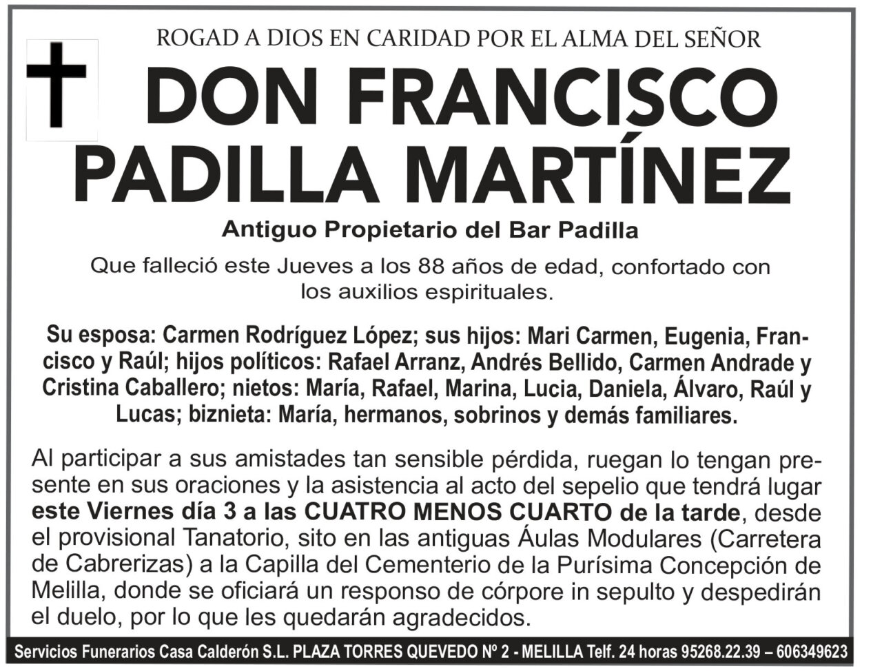 Esquela publicada en memoria de Don Francisco Padilla Martínez. Falleció a los 88 años.