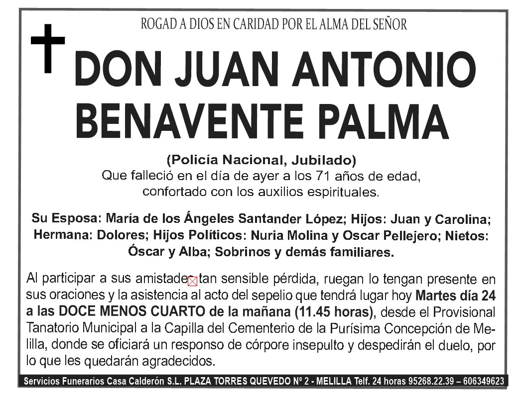 Al participar a sus amistades tan sensible pérdida, ruegan lo tengan presente en sus oraciones y la asistencia al acto del sepelio que tendrá lugar hoy Martes día 24 a las DOCE MENOS CUARTO de la mañana, desde el Provisional Tanatorio Municipal a la Capilla del Cementerio de la Purísima Concepción de Melilla, donde se oficiará un responso de córpore insepulto y despedirán el duelo, por lo que les quedarán agradecidos.