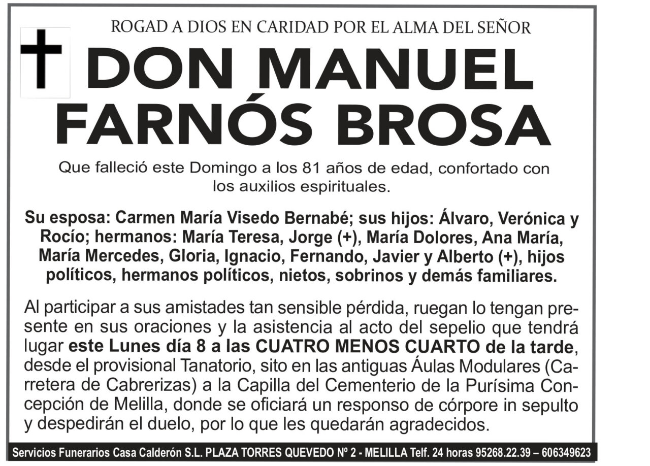 Al participar a sus amistades tan sensible pérdida, ruegan lo tengan presente en sus oraciones y la asistencia al acto del sepelio que tendrá lugar este Lunes día 8 a las CUATRO MENOS CUARTO de la tarde, desde el Provisional Tanatorio Municipal a la Capilla del Cementerio de la Purísima Concepción de Melilla, donde se oficiará un responso de córpore insepulto y despedirán el duelo, por lo que les quedarán agradecidos.
