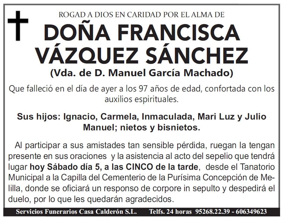 Al participar a sus amistades tan sensible pérdida, ruegan la tengan presente en sus oraciones y la asistencia al acto del sepelio que tendrá lugar hoy Sábado día 5, a las CINCO de la tarde, desde el Tanatorio Municipal a la Capilla del Cementerio de la Purísima Concepción de Melilla, donde se oficiará un responso de corpore in sepulto y despedirá el duelo, por lo que les quedarán agradecidos.