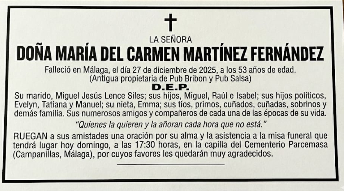 Doña María del Carmen Martínez Fernández falleció en Málaga a los 53 años.