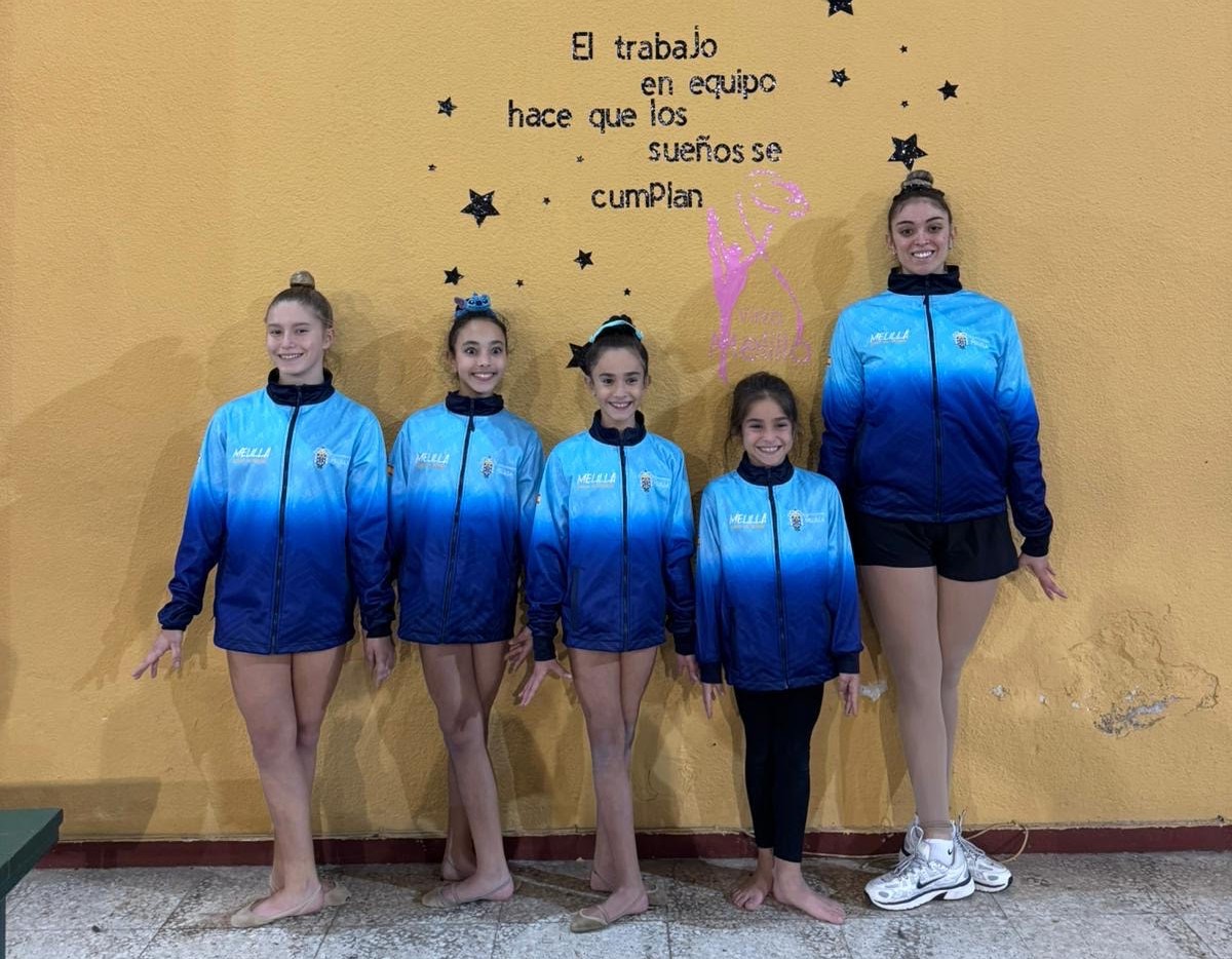Las gimnastas muestran su unidad y trabajo en equipo con chaquetas azules.
