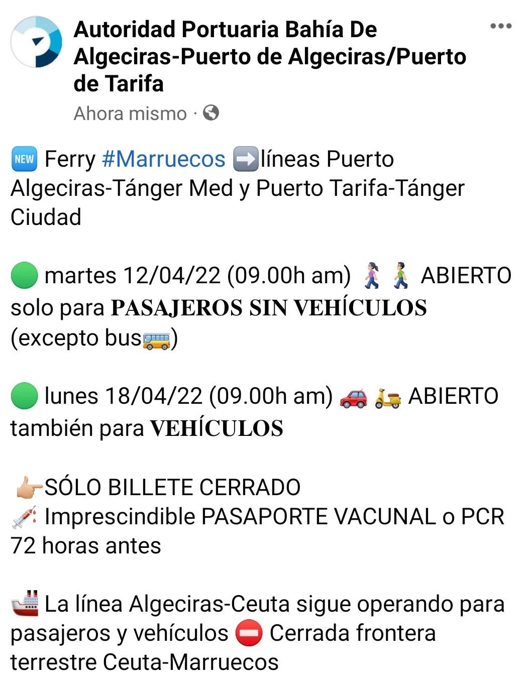 Por otro lado, la APBA ha recordado que la línea Algeciras-Ceuta sigue operando para pasajeros y vehículos. La frontera terrestre entre Ceuta y Marruecos, en cambio, permanece cerrada.